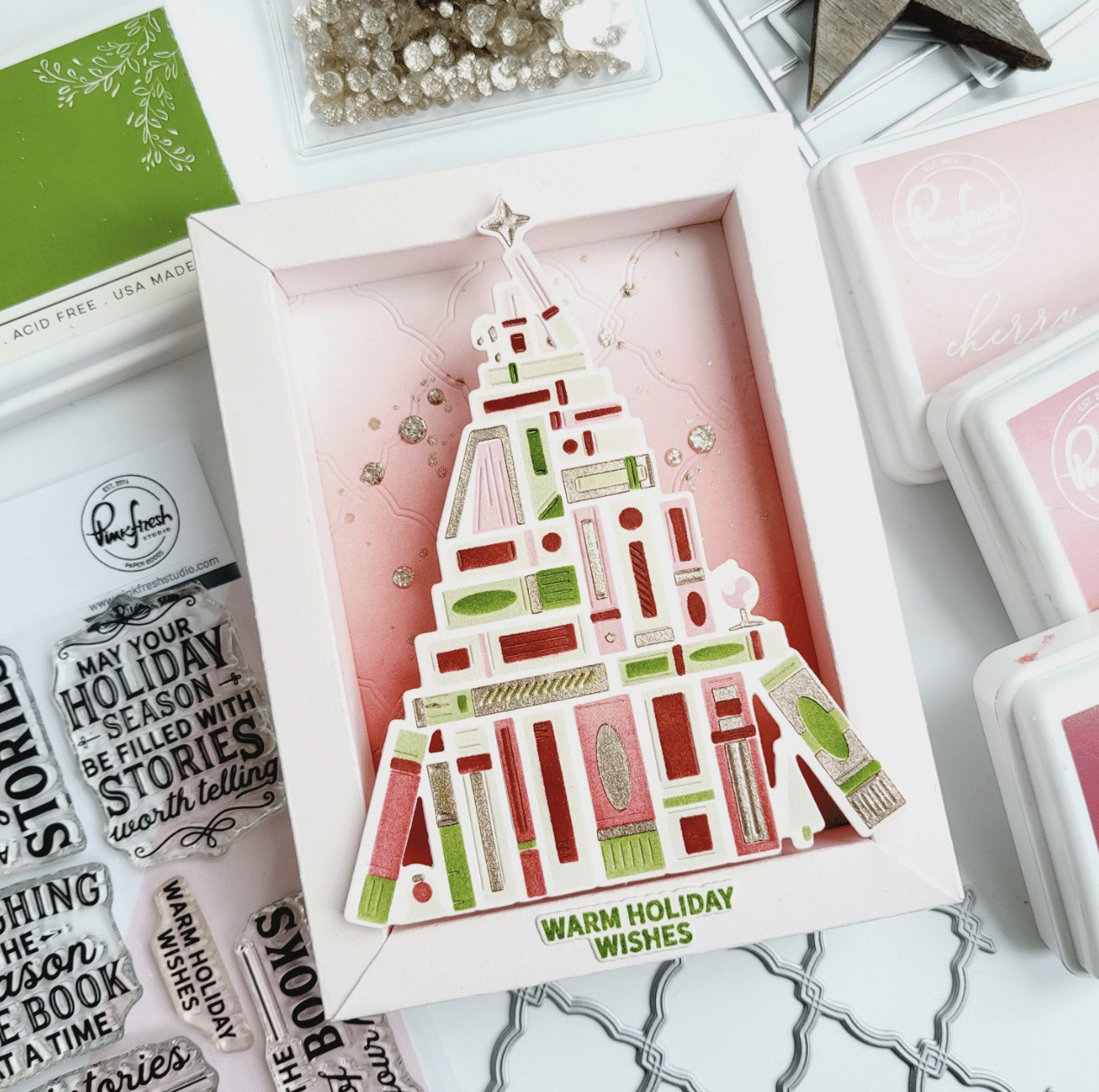 Celebra la magia dei libri con questo albero di Natale a tema letterario, disegnato da Inna Moreva. Perfetto da abbinare a sentiment natalizi dedicati alla lettura, brilla su card, segnalibri e tag regalo.