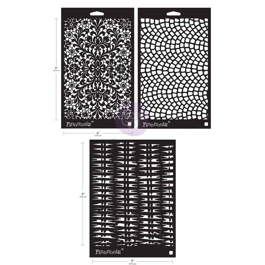 Set di stencil in edizione limitata “Knots & Knits” di Finnabair, 3 pezzi (2 da 6″ x 9″ + 1 da 7″ x 9″), ispirati a tessuti intrecciati e motivi annodati.