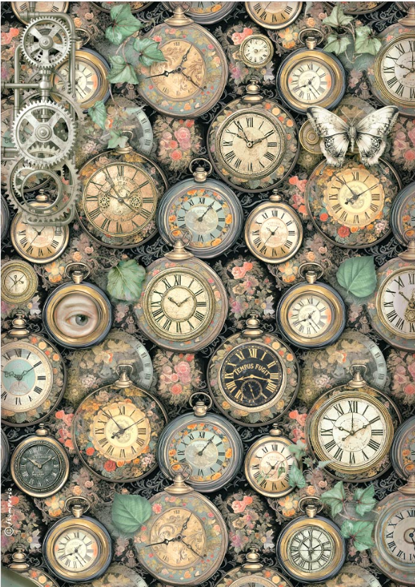 STAMPERIA – Collezione Gardens of Time –  Printed A4 Rice paper for Art and Craft – Gardens of Time clock pattern
