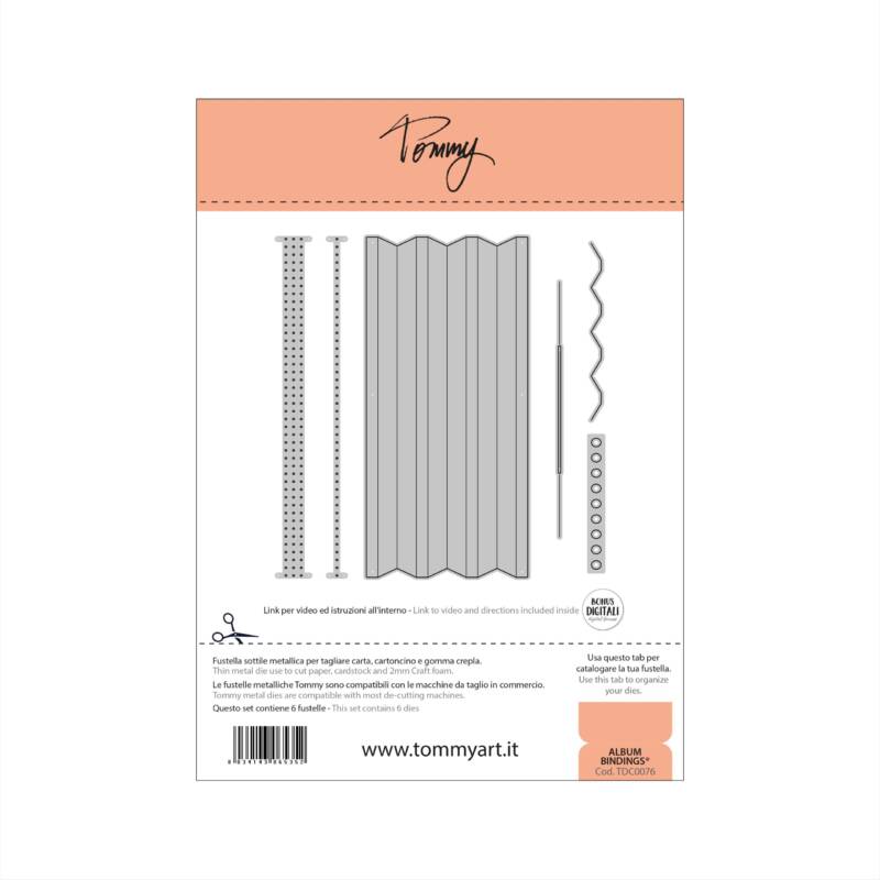 Le fustelle sono accompagnate da un foglio metallico (15 cm x 21cm) e da una busta in plastica con bottone richiudibile. Il formato del foglio metallico è perfetto da inserire nei raccoglitori della linea Tommy. Il piccolo tab nel cartoncino di presentazione potrà essere utilizzato per catalogare la fustella.