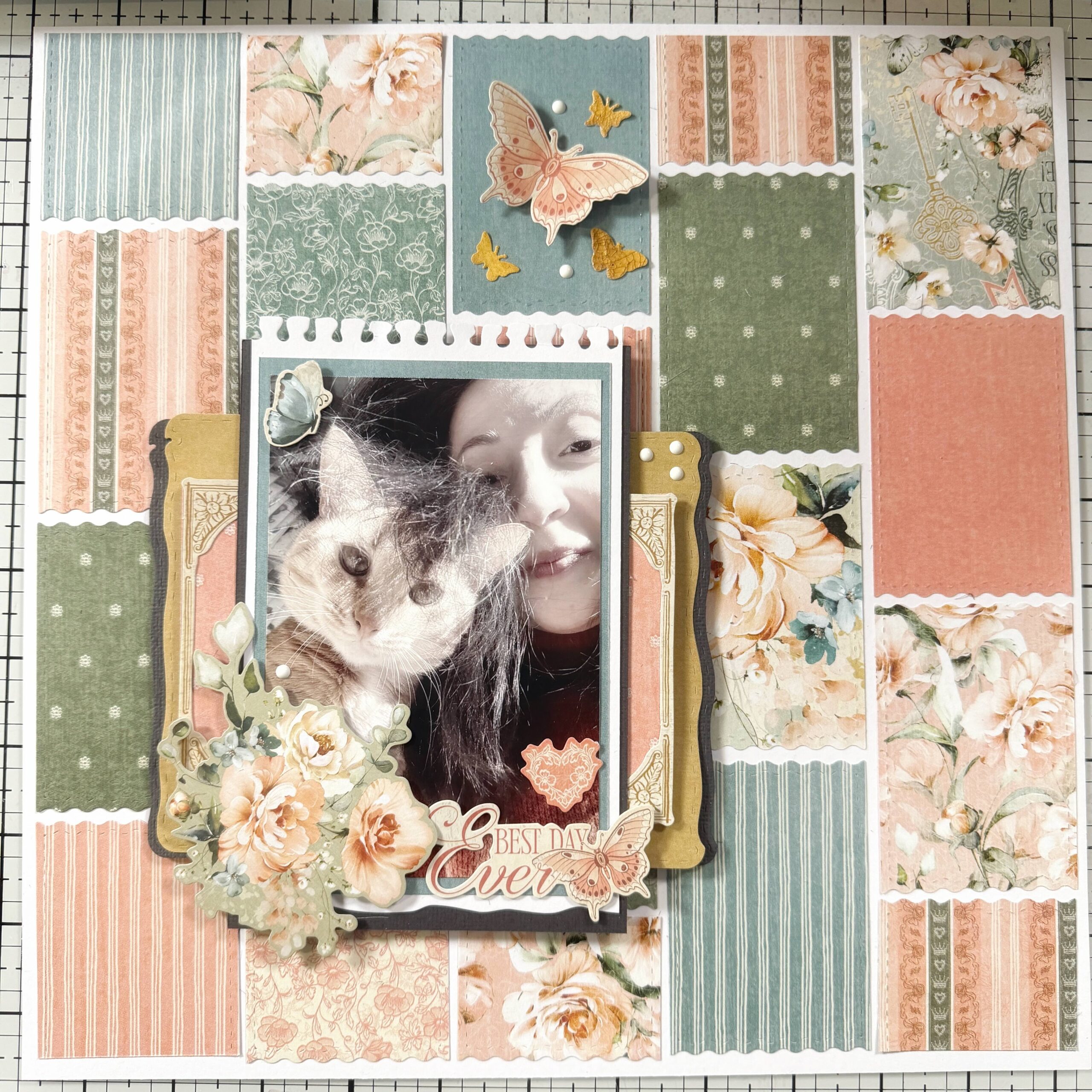 Utilizzando la fustella pannello n.2 abbiamo creato una base effetto โtappezzeriaโ, giocando con le diverse carte della collezione Always & Forever di Graphic 45.