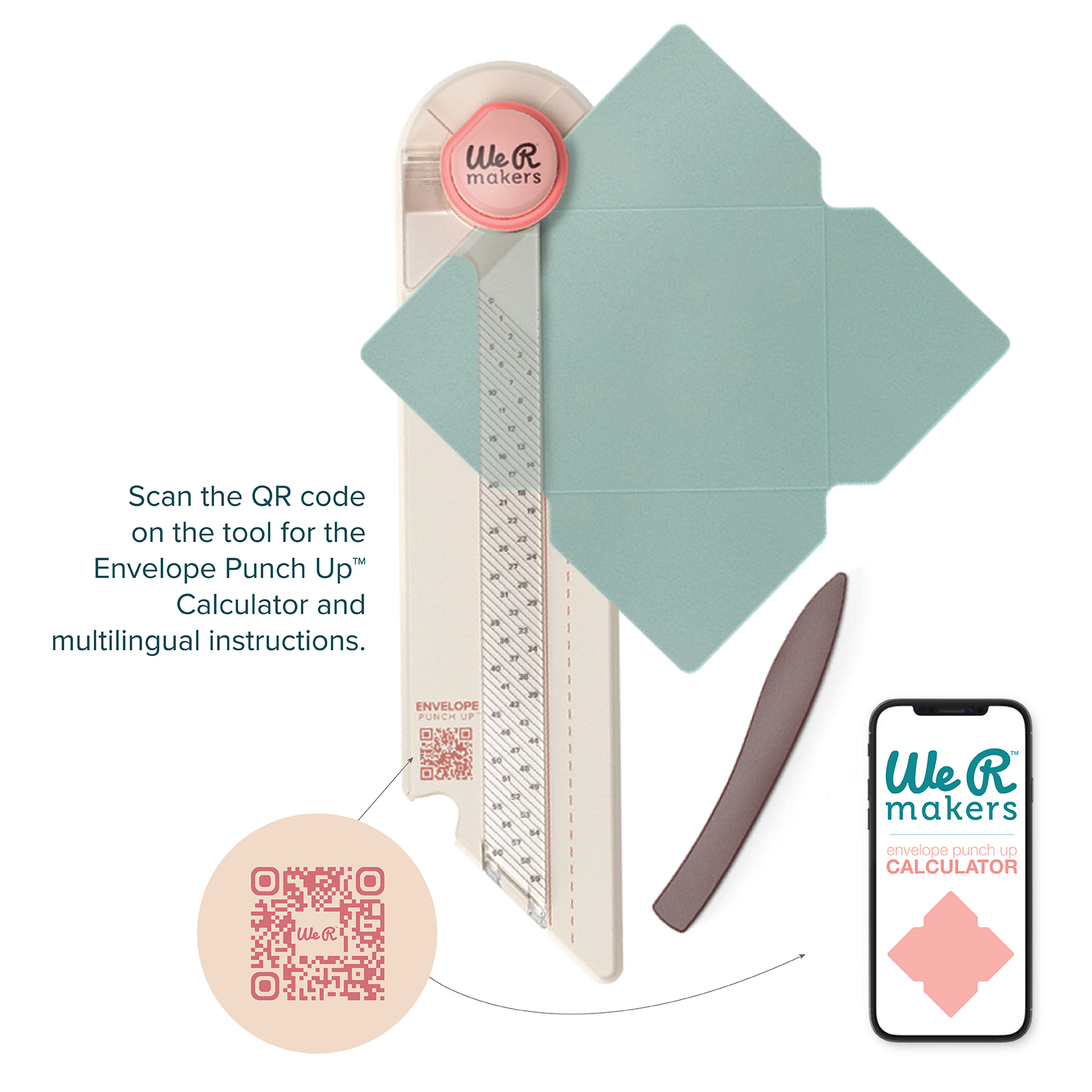 Passaggi guidati e QR code integrato per accedere al Envelope Punch Up™ Calculator: misure e istruzioni sempre disponibili.
